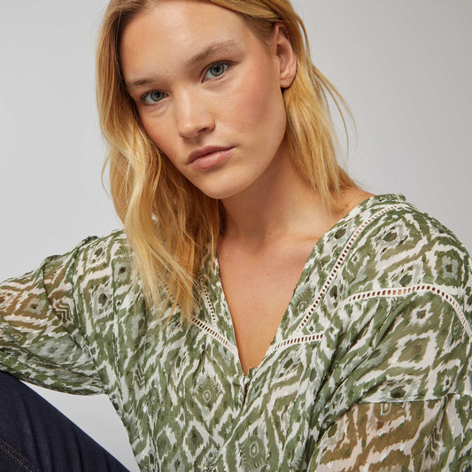 -20%بلوزة من القماش السويسري منقطة بفتحة رقبة على شكل حرف V باللون الكاكي