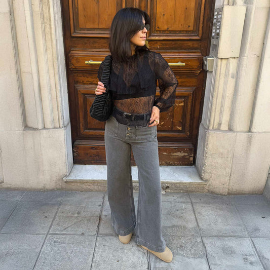 -20%بنطال جينز واسع الساق عالي الخصر باللون الرمادي