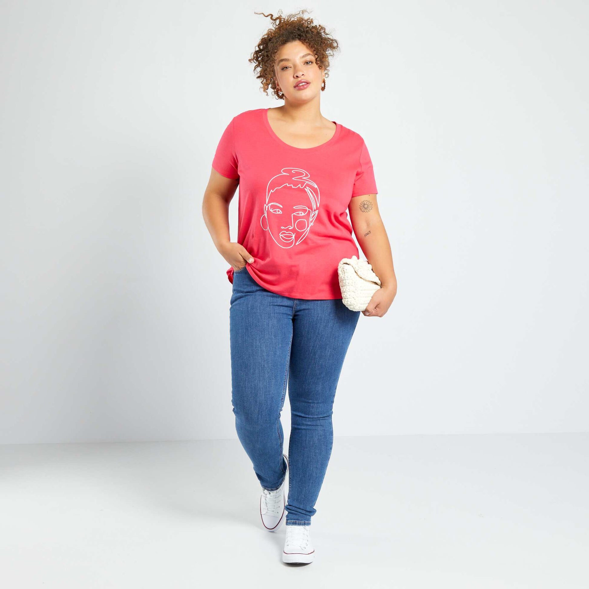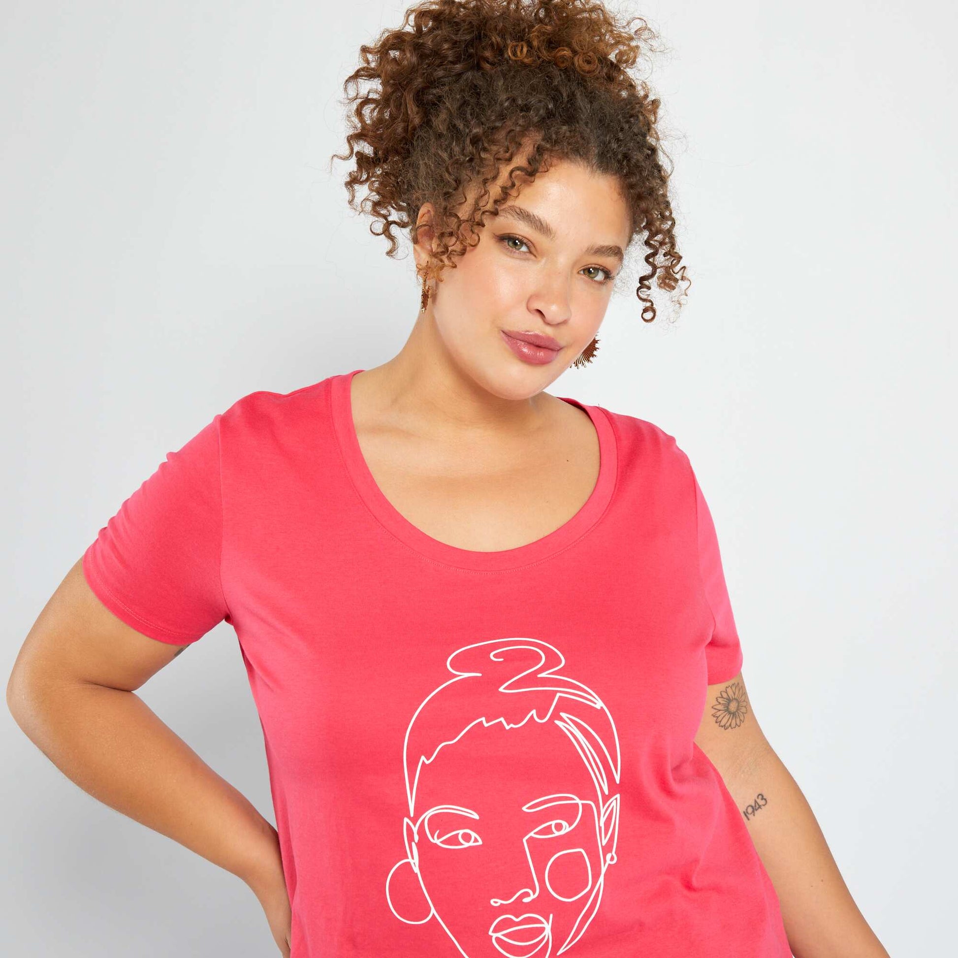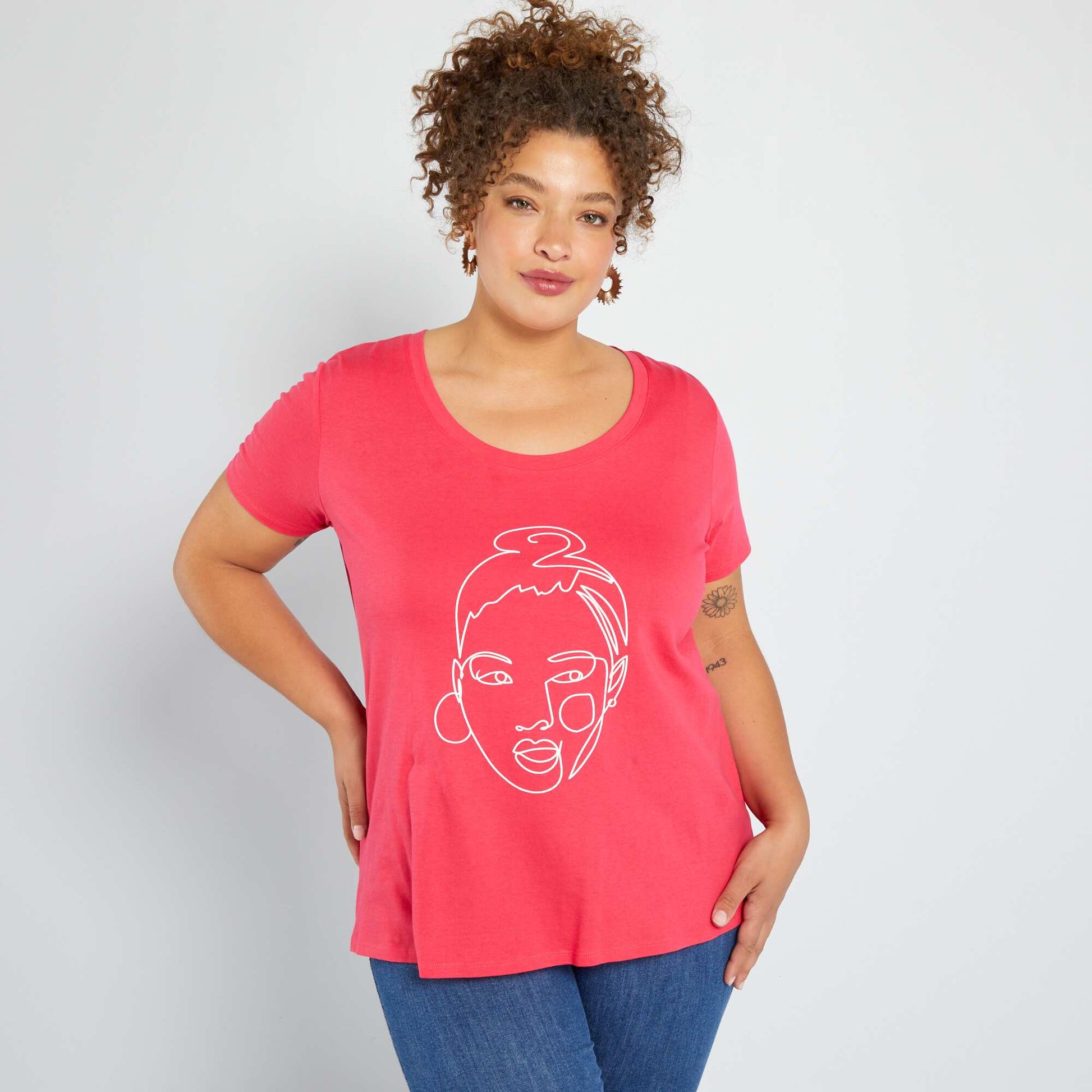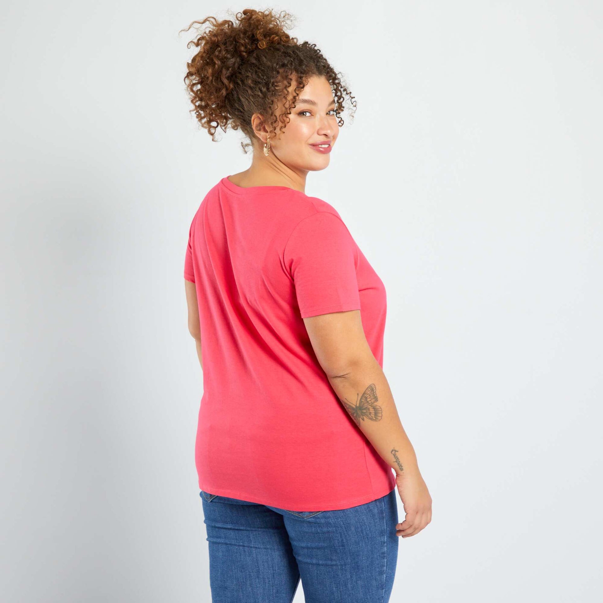 تي شيرت مطبوع برقبة دائرية باللون الوردي
